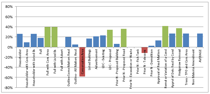 Some types of application (shown in green) outperformed the average yearly increase, in particular “Full With Conservation Area”, “Full with Listed Buildings” and “Removal or Variation of a Condition” at around a 40% increase. The falls we saw were either down to policy changes (affecting Conservation Area) or change in business practices (some Prior Notifications).