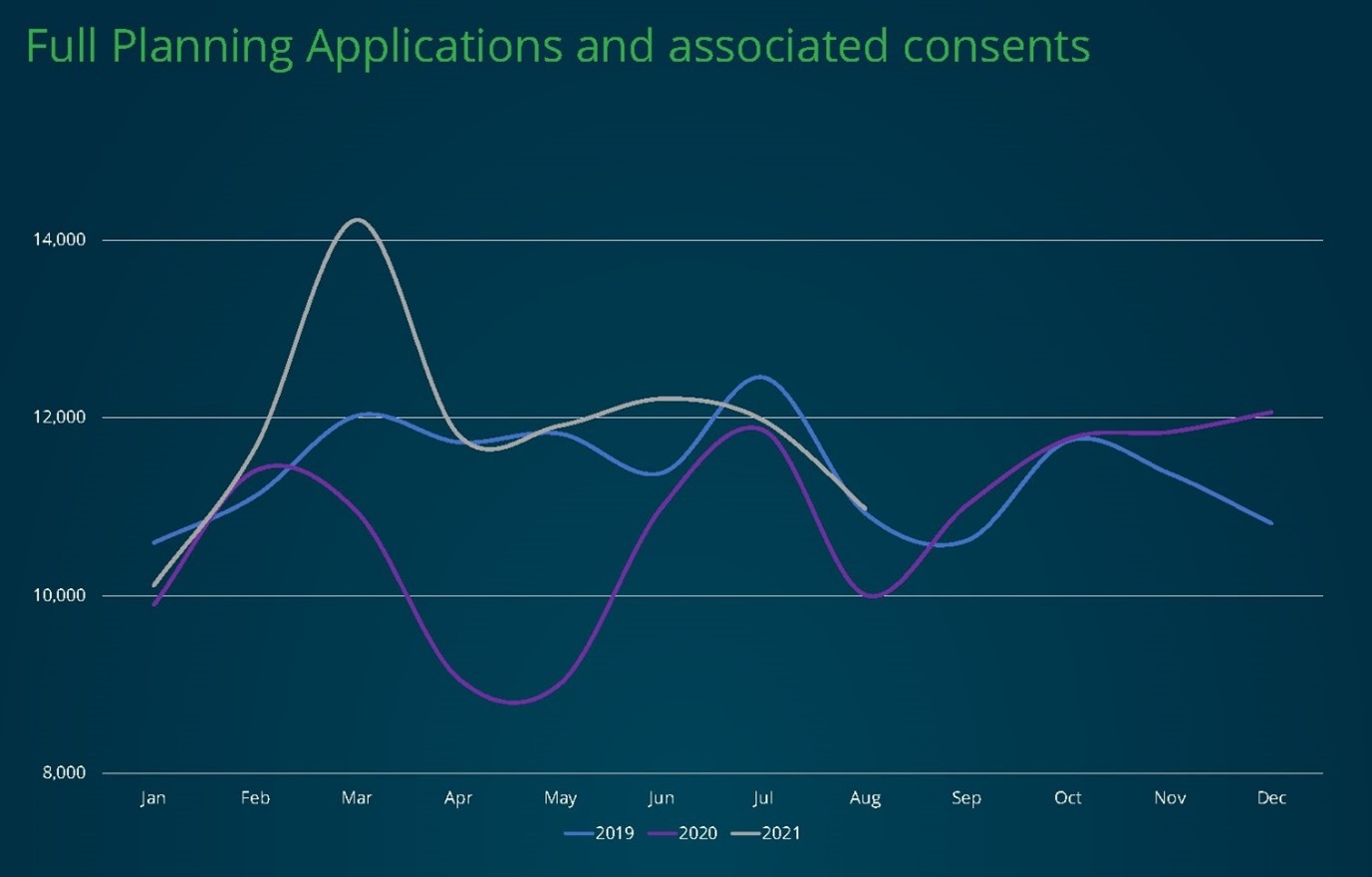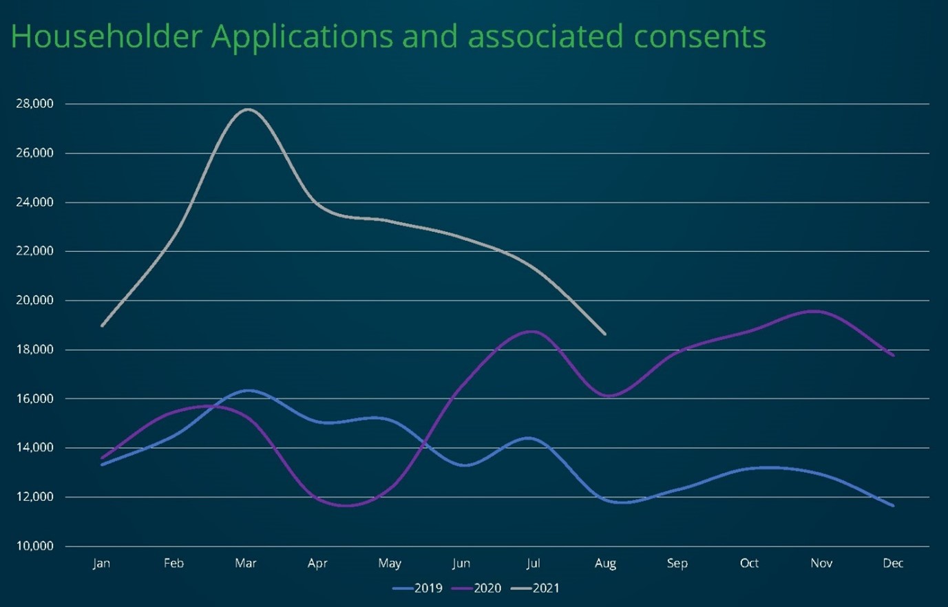 September’s Planning Market Insight Report revealed that applications for home improvements continued to outperform the average rise in applications in August, but for the first time since applications began to recover last June the difference was negligible. In August, Homeowner and associated consents were 15 per cent higher than August 2020, compared to an increase of 8 per cent in applications overall. This 7 per cent difference is similar to that seen in July (6 per cent), and lower than the 20 per cent difference in June applications. Both July and August figures indicate the beginning of a slowdown in applications related to home improvements, which have consistently outperformed the baseline increase over the last 12 months.