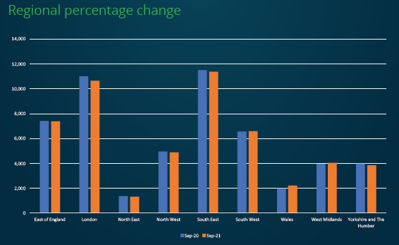 For a period of a few months over the last year, the South West was booming in terms of applications submitted, regularly demonstrating a large percentage increase. When comparing September 2021 with 2020 in the South West, the numbers have remained steady with little change. Following a dip throughout the summer, it is possible the number of submissions will increase, with the last two months seeing a month on month increase of two per cent in applications. The detail can be seen in the bar chart below, which demonstrates the volume submitted in each region of England and in Wales in September 2020 and 2021.