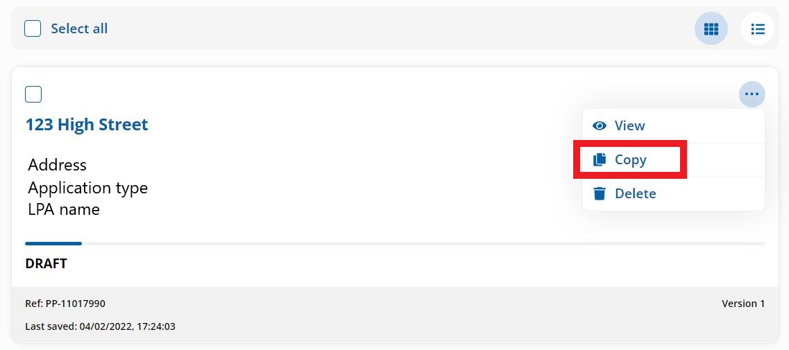 The issue affecting payment and submission of some applications created on the old system has been our priority since Monday. Fixes have been applied but for the small number of remaining customers affected, using the copy facility (shown below) to replicate the application and submit, works. One further fix related to this is under investigation, and we are confident that once the fix is put in place, this issue will be resolved.