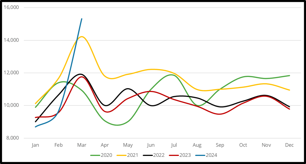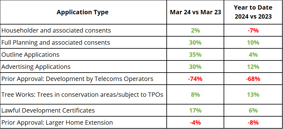 Excluding Works to Protected Trees and Telecoms applications, the total number of applications for March was 60,230 – this is 12% higher than in March 2023, which had a total of 53,585 applications.
