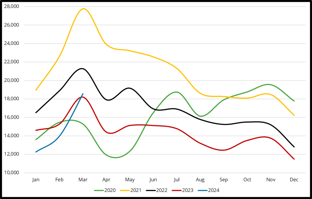 Most regions saw an increase in applications compared to March last year, with the South-East being the lowest with just an 8% increase, whilst Wales achieving the highest incline at 15% incline, which equates to an additional 331 applications.