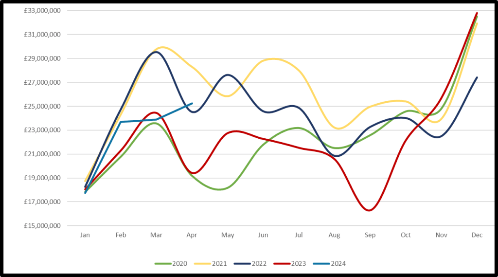A total of £25,233,121 in planning fees were processed in March, which is an increase of 30% when compared to March 2023. This again reflects the higher submission rate prompted by the change to BNG requirements.