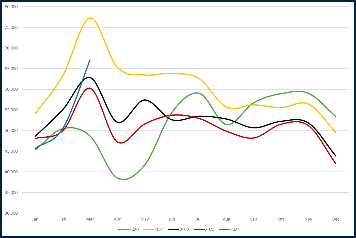 There were a total of 67,103 applications submitted through the Planning Portal in March 2024. This is 11% higher than the total number of applications that were submitted in March 2023. This shows a good recovery for the first quarter of 2024.