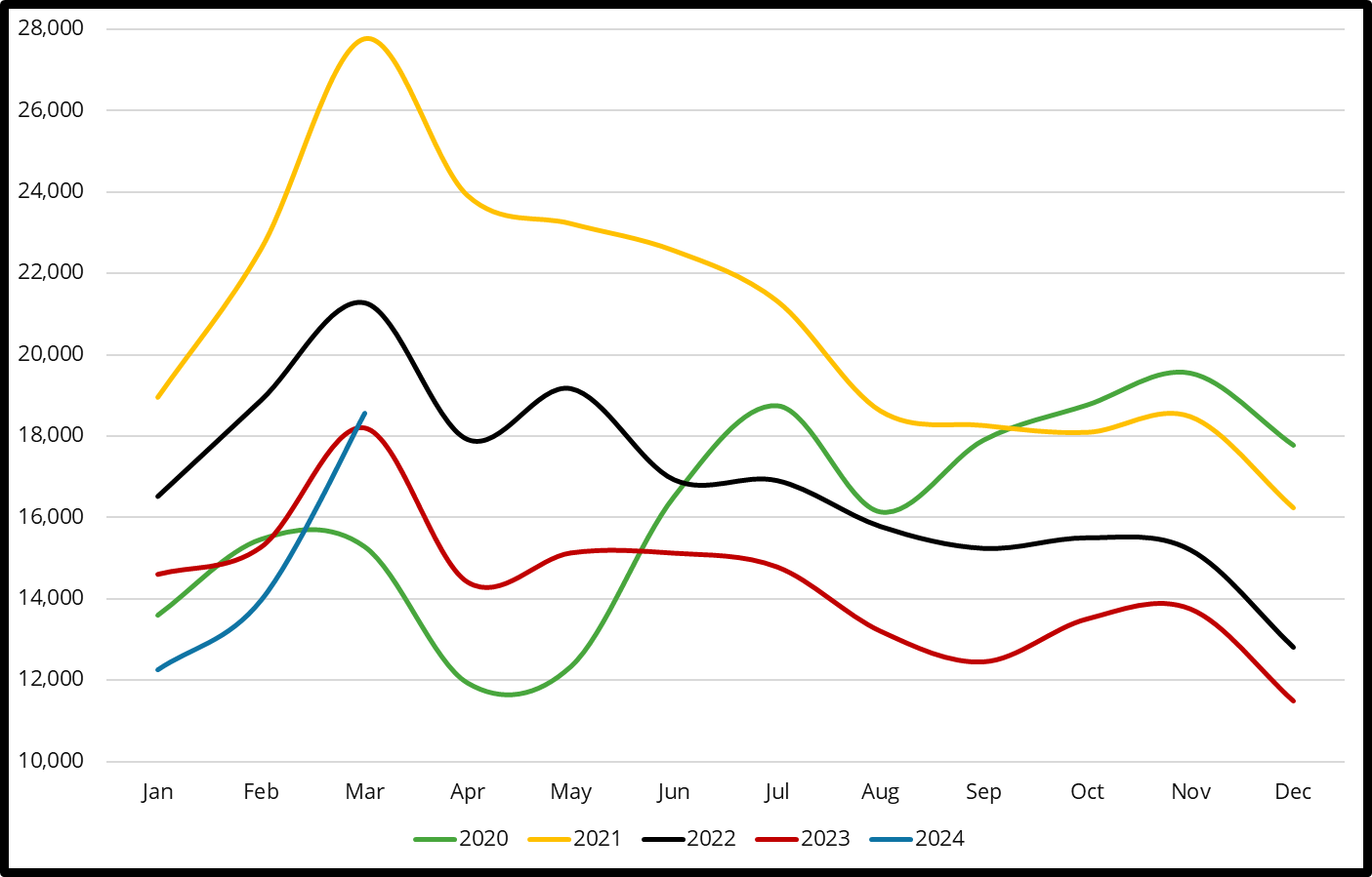 Excluding Works to Protected Trees and Telecoms applications, the total number of applications for March was 60,230 – this is 12% higher than in March 2023, which had a total of 53,585 applications.