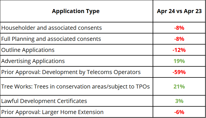 The greatest shift in April was for minor application types such as advertising, applications for tree works and lawful development certificates. All seeing increases compared to April 23.
