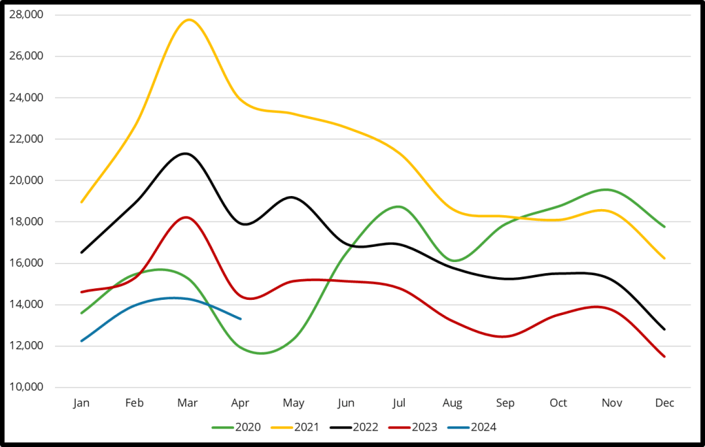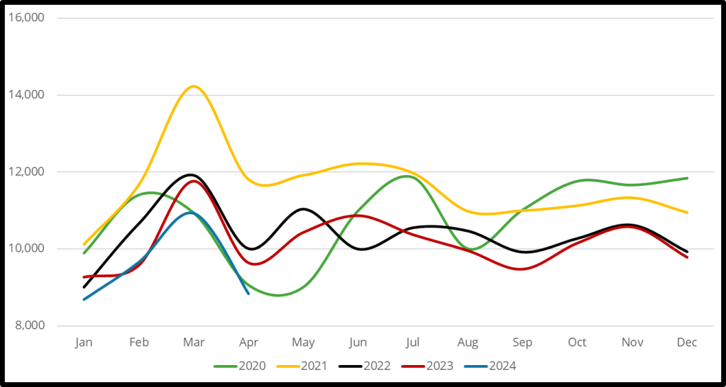 This month every region in England saw a negative percentage decrease, while Wales had a minor uplift in applications against March 2024. Wales had an additional 110 applications compared to the month prior, alongside a 12% increase against April 2023.