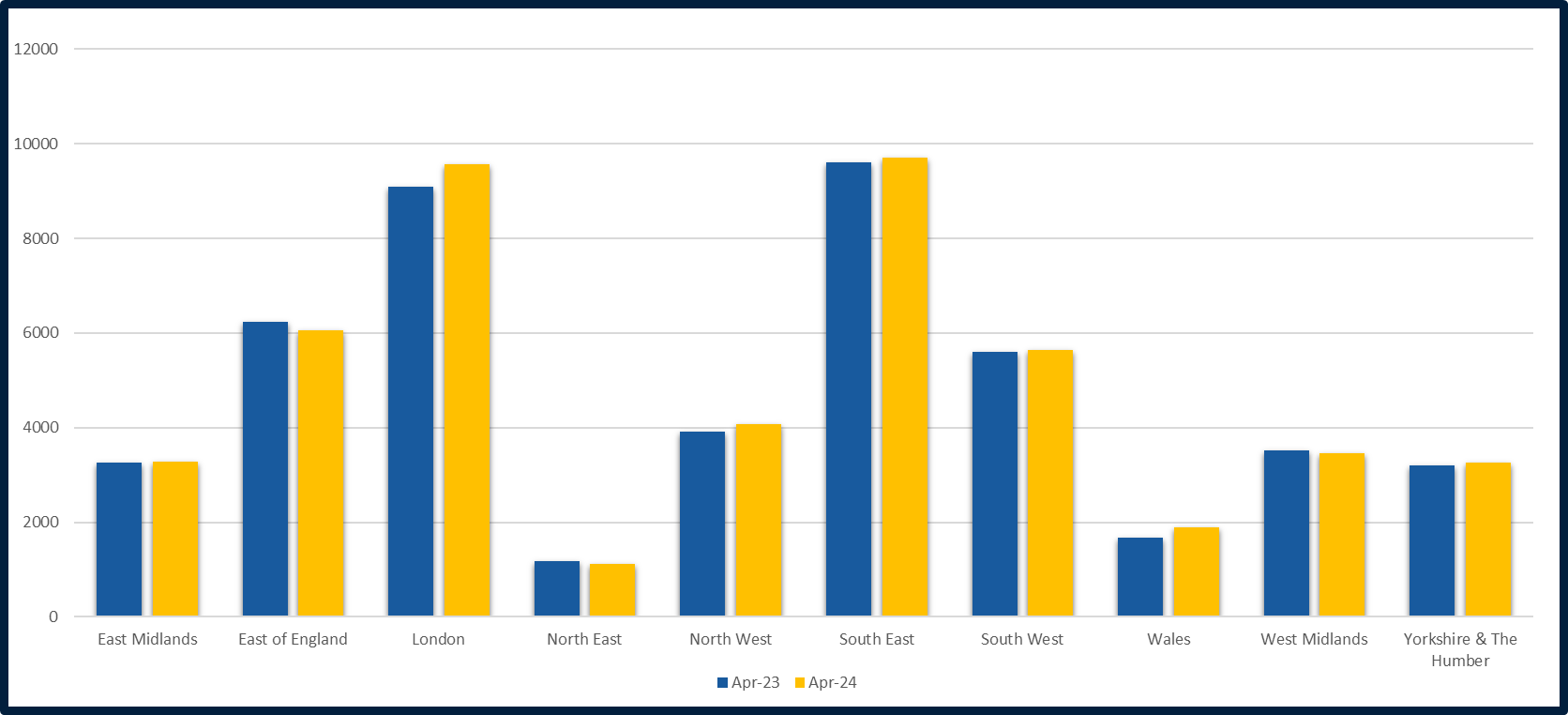 The general trend shows all regions, except Wales, remained at a similar volume compared to April 2023. The biggest variance is London with a 5% increase and the North-East with a 5% decrease.