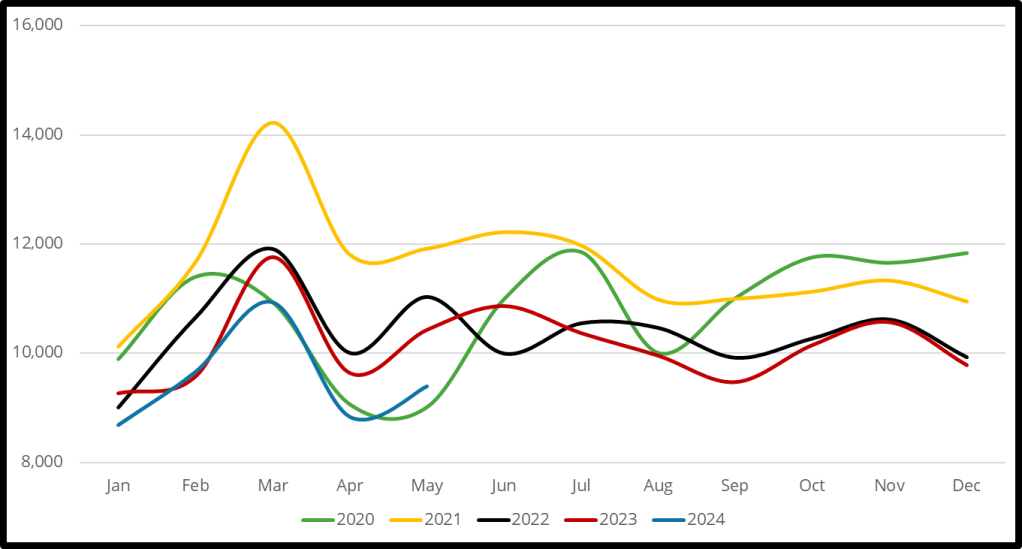 Full applications also dropped by around a thousand applications when compared to May 2023. However, these were also at an increase of 6% from April 2024, returning to more of a ‘normal’ level, albeit being on a continued downward trend.