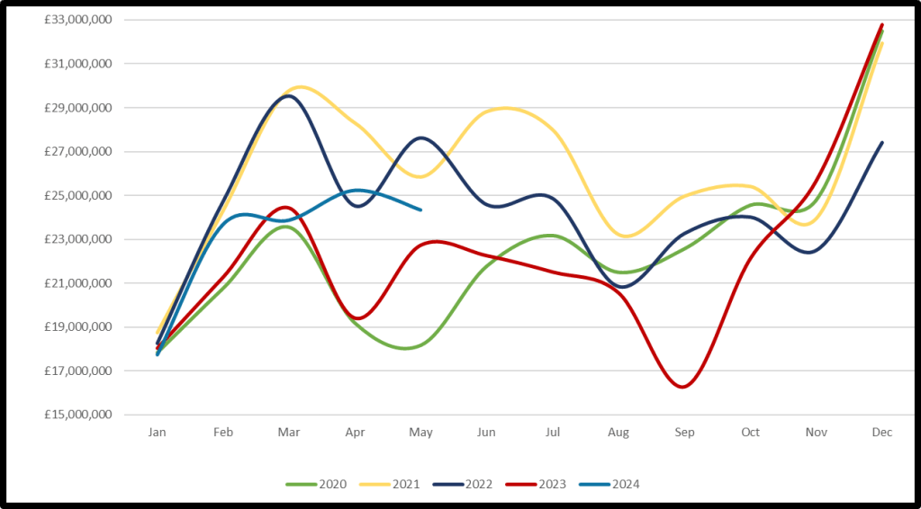 A total of £24,341,193 in planning fees was processed in May 2024, around 7% higher than May 2023. This is almost a million less than in April 2024. This broadly aligns with the combined effect of falling submission numbers and increased fees.