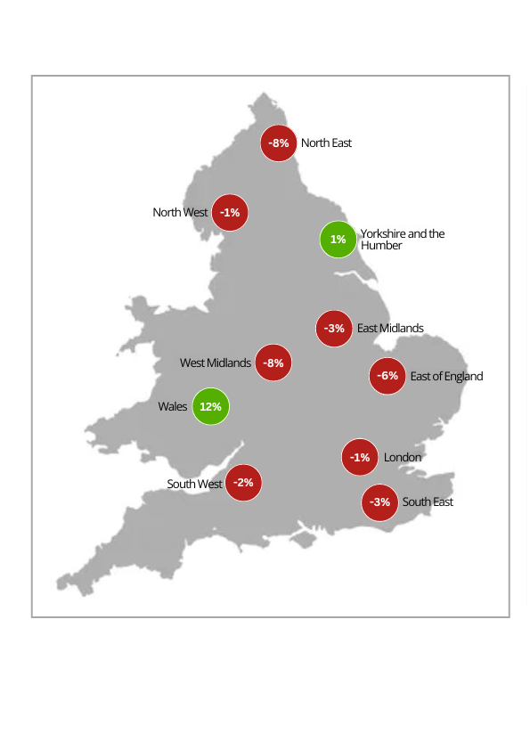 The general trend shows a single digit percentage decrease for all English regions, whilst Wales saw a 12% increase compared to May 2023. The largest decreases of 8% were seen in the North West and West Midlands.