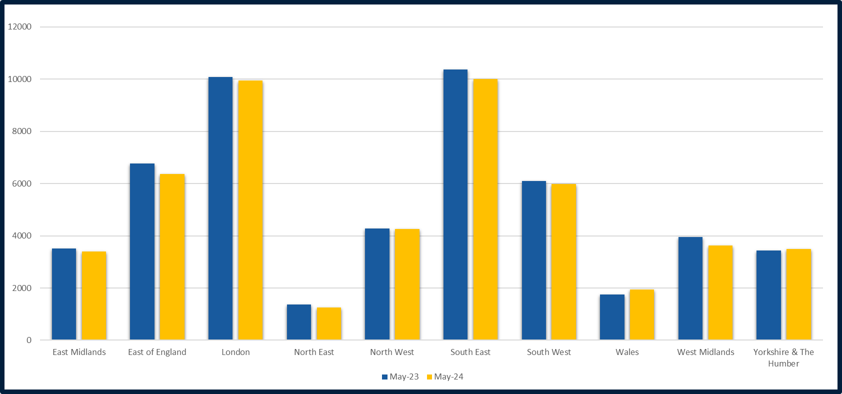 The general trend shows a single digit percentage decrease for all English regions, whilst Wales saw a 12% increase compared to May 2023. The largest decreases of 8% were seen in the North West and West Midlands.