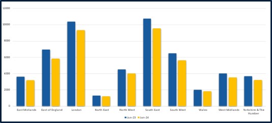 The general trend shows a single digit percentage decrease for all English regions, whilst Wales saw a 12% increase compared to June 2023. The largest decreases of 8% were seen in the North West and West Midlands.