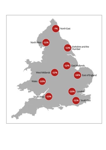 The general trend compared to the same month a year prior shows a double digit percentage decrease for all regions apart from the North East. The biggest decrease (of -16%) was seen in the East of England.
