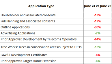 The table below shows how applications by type have risen or fallen, compared with June 2023.