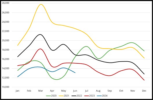 Householder applications are down over 2,000 against June 2023 and down just over 1,000 from May 2024.