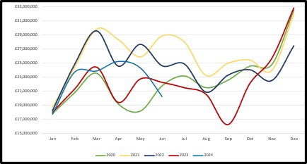 A total of £20,265,858 in planning fees was processed in June, around 9% lower than June 2023. Over £4 million less than in May 2024. This broadly aligns with the combined effect of falling submission numbers.