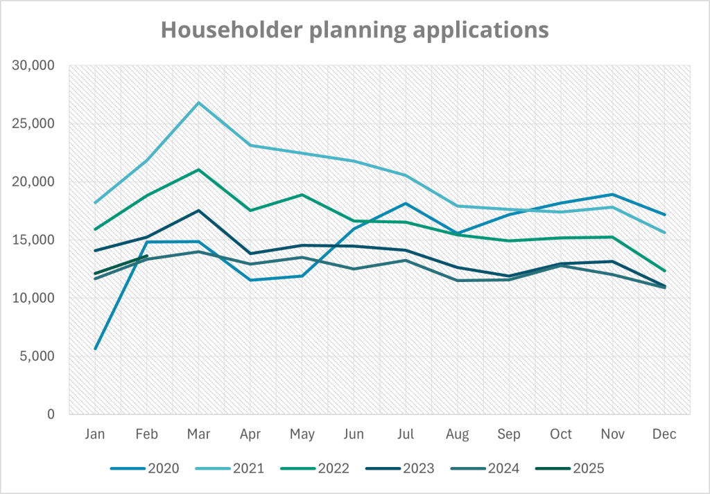 Householder applications continued to climb, rising 2% year-on-year and seeing a 13% surge from January. Larger Home Extensions also saw steady growth, up 9% (+98 applications). Full applications followed a similar pattern, increasing 12% month-on-month, though they dipped slightly compared to February 2024 (-2%, or 137 fewer applications). Meanwhile, Outline applications saw a modest 5% decline (-18 applications), and Telecommunications applications took the biggest hit, dropping 30% (-38 applications) year-on-year.