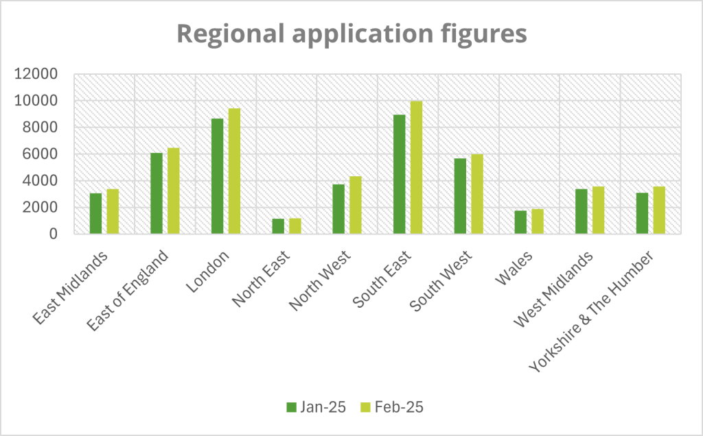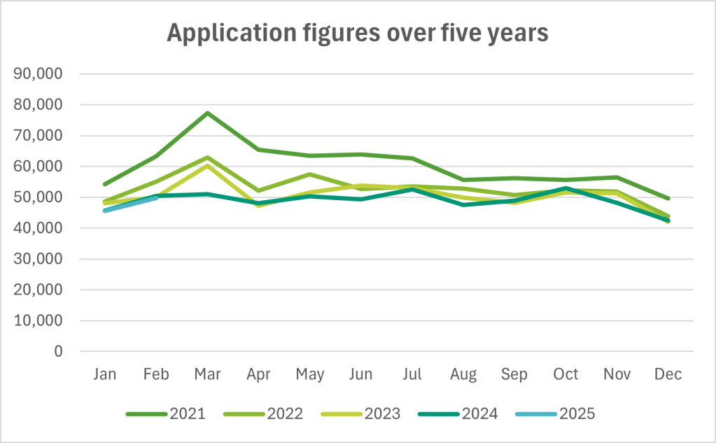 A total of 49,745 applications were submitted in February 2025 – a 9% rise from January and a 3% increase compared to February 2024. This equates to over 1,500 more applications year-on-year.
