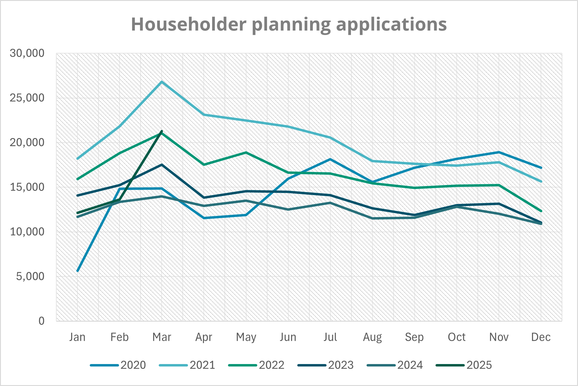 Full planning applications also saw a significant rise. March 2025 recorded nearly 2,500 more submissions than February, a 28% increase. Compared to March 2024, numbers were up by 667 applications, reflecting a more modest but still notable 6% year-on-year growth.