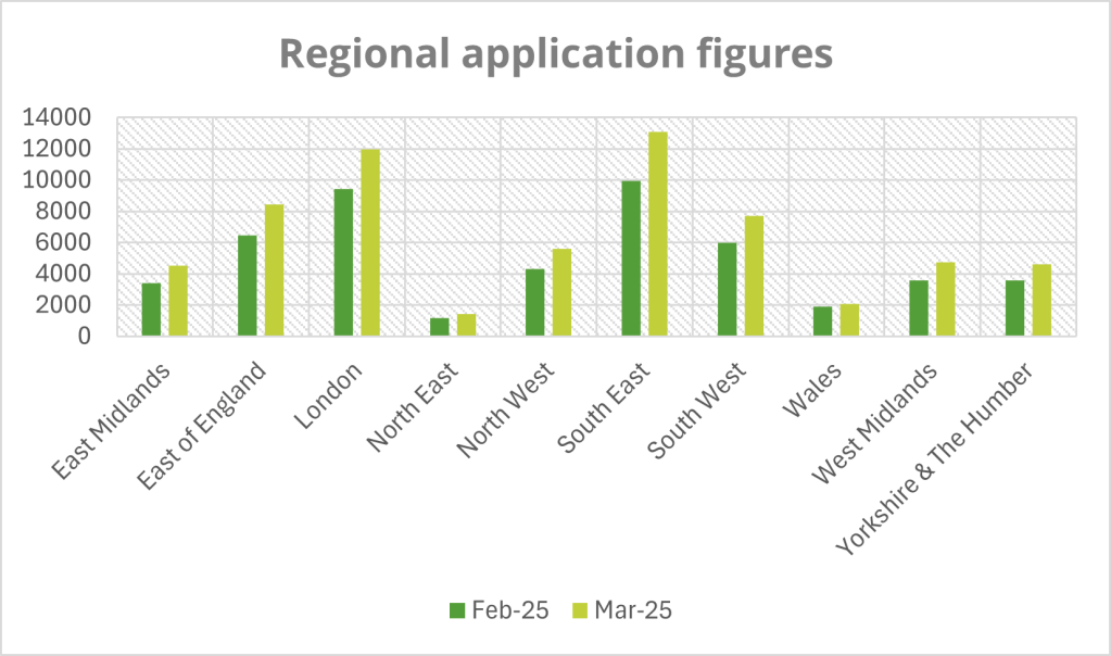 Every region saw growth compared to February, with Yorkshire and the Humber experiencing a standout 37% increase—3,265 more applications than the previous year. The South East recorded the largest overall rise, with 3,000 additional applications, a 30% year-on-year jump.