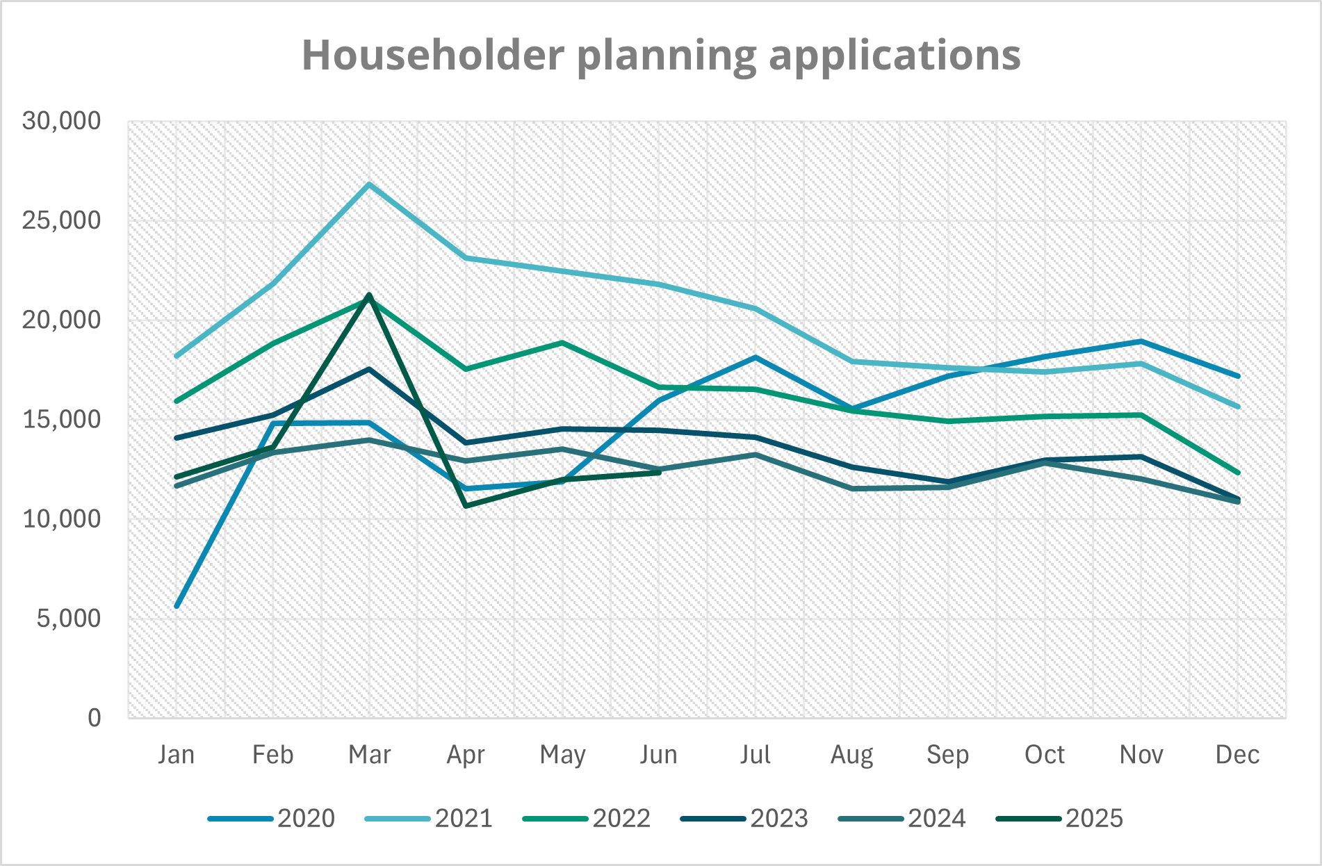 Looking more closely at application types, full planning applications are driving much of this growth, up 19% compared to June 2024, with an increase of nearly 1,500 applications. Outline applications saw an even sharper rise, up 32%, though from a smaller base. Householder applications dipped slightly by 2% year-on-year but still rose 3% compared to May 2025.