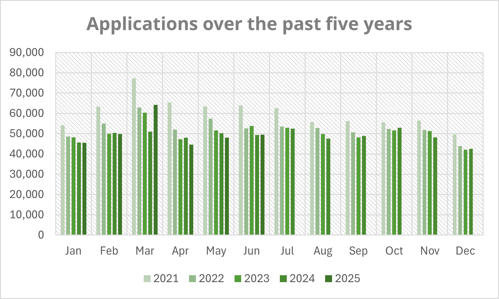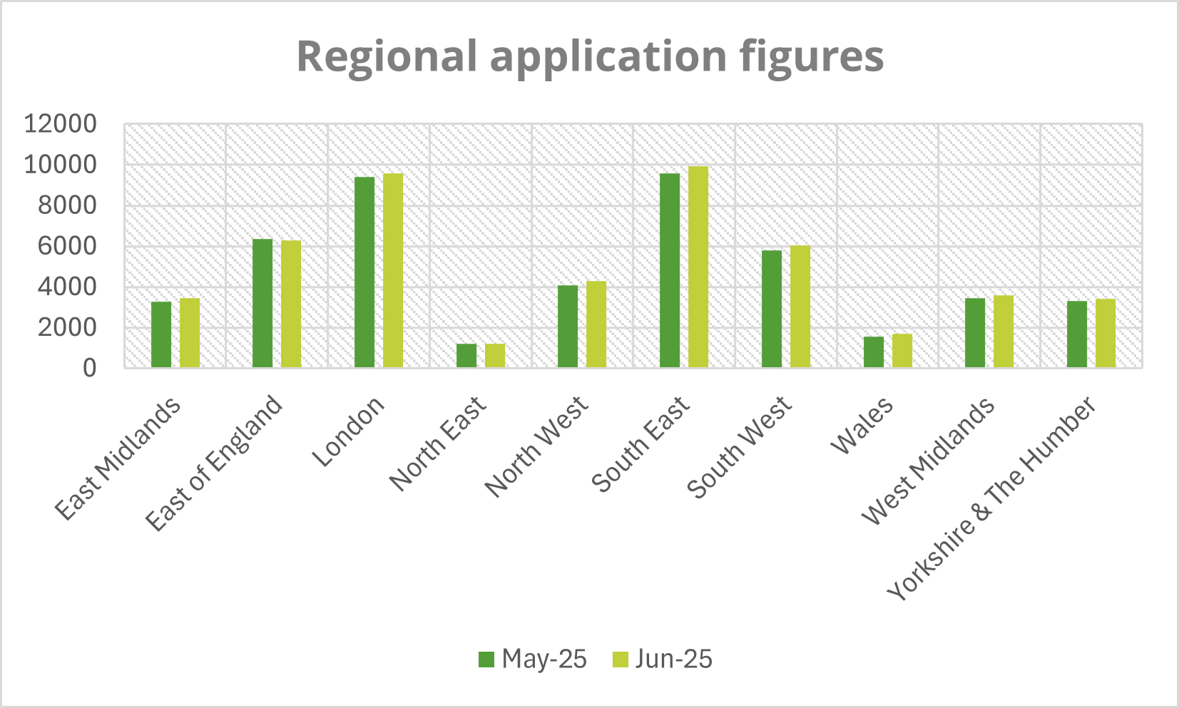 Most regions experienced growth compared to June 2024, with all English regions seeing increases of 6% or more. The East of England and East Midlands led the way, each recording a 15% rise, with the East of England posting the largest volume increase – 820 additional applications compared to the previous year.