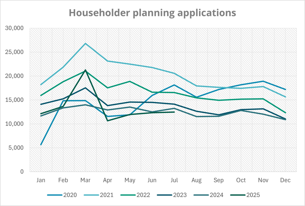 Householder applications fell 6% compared with July 2024, but was up 1% compared to June 2025. Larger home extensions declined by 2% (21 applications) compared with June 2024.