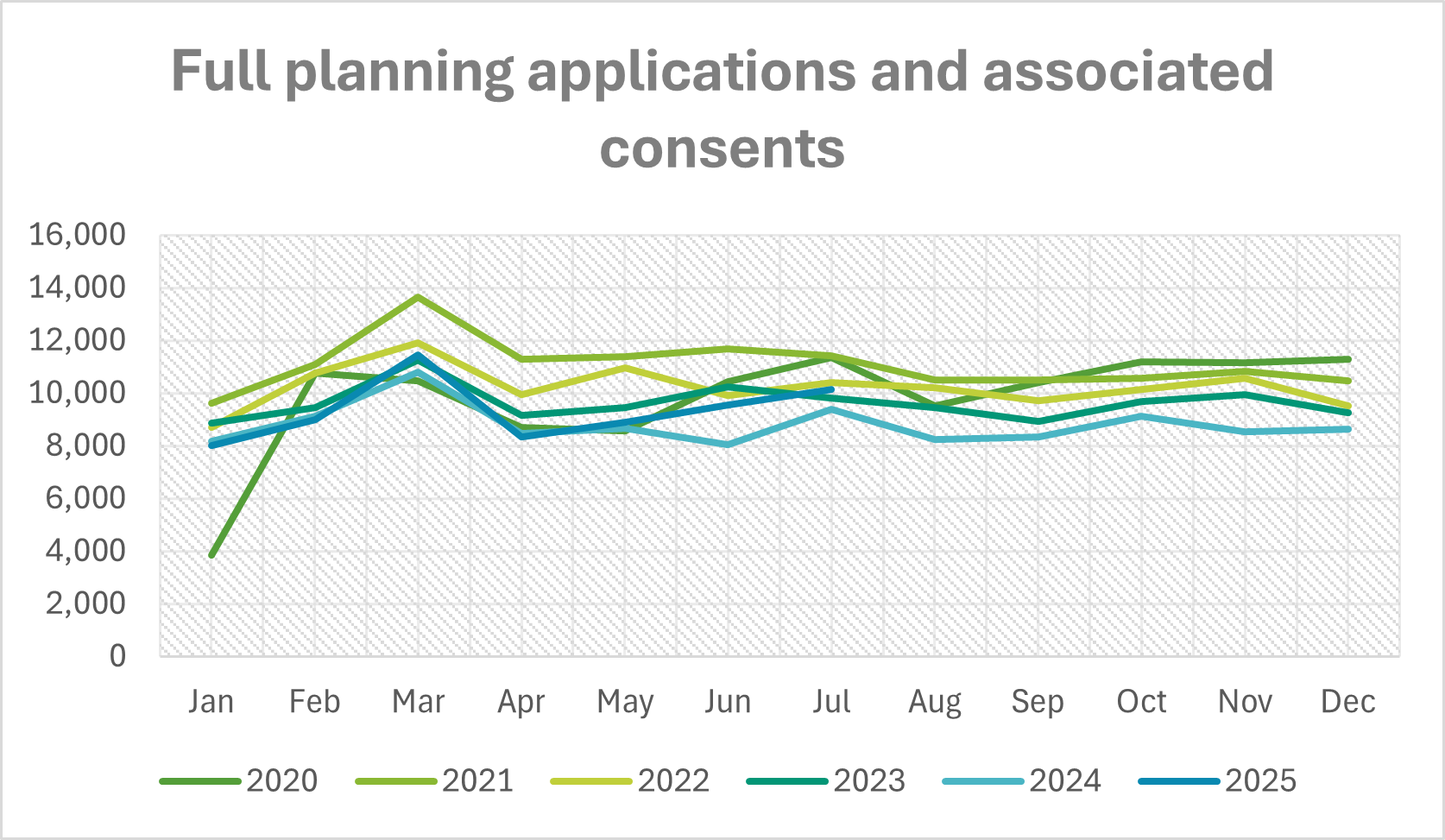 In July 2025, a total of 51,508 planning applications were submitted – a 2% increase on both July 2024 and July 2023. This continues the upward trend highlighted in our recent Market Index, with application volumes generally higher than in previous years.